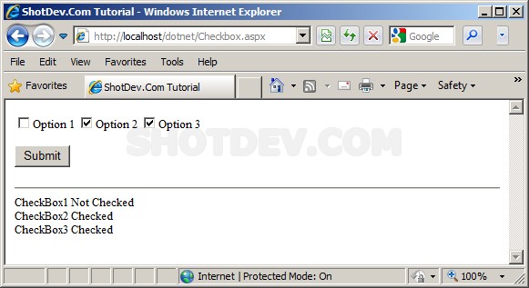<%@ Page Language="VB" %> <script runat="server"> Sub btnSubmit_OnClick(Obj as Object, e As EventArgs) IF Me.CheckBox1.Checked = True Then Me.lblText1.Text = "CheckBox1 Checked" Else Me.lblText1.Text = "CheckBox1 Not Checked" End IF IF Me.CheckBox2.Checked = True Then Me.lblText2.Text = "CheckBox2 Checked" Else Me.lblText2.Text = "CheckBox2 Not Checked" End IF End Sub Sub CheckBox3_CheckedChanged(Obj As Object, e As EventArgs) Handles CheckBox3.CheckedChanged IF Me.CheckBox3.Checked = True Then Me.lblText3.Text = "CheckBox3 Checked" Else Me.lblText3.Text = "CheckBox3 Not Checked" End IF End Sub </script> <html> <head> <title>ShotDev.Com Tutorial</title> </head> <body> <form runat="server"> <asp:CheckBox id="CheckBox1" runat="server" Text="Option 1"></asp:CheckBox> <asp:CheckBox id="CheckBox2" runat="server" Text="Option 2"></asp:CheckBox> <asp:CheckBox id="CheckBox3" runat="server" Text="Option 3" AutoPostBack="True"></asp:CheckBox> <br /> <br /> <asp:Button id="btnSubmit" onclick="btnSubmit_OnClick" runat="server" Text="Submit"></asp:Button> <br /> <br /> <hr /> <asp:Label id="lblText1" runat="server"></asp:Label> <br /> <asp:Label id="lblText2" runat="server"></asp:Label> <br /> <asp:Label id="lblText3" runat="server"></asp:Label> </form> </body> </html>